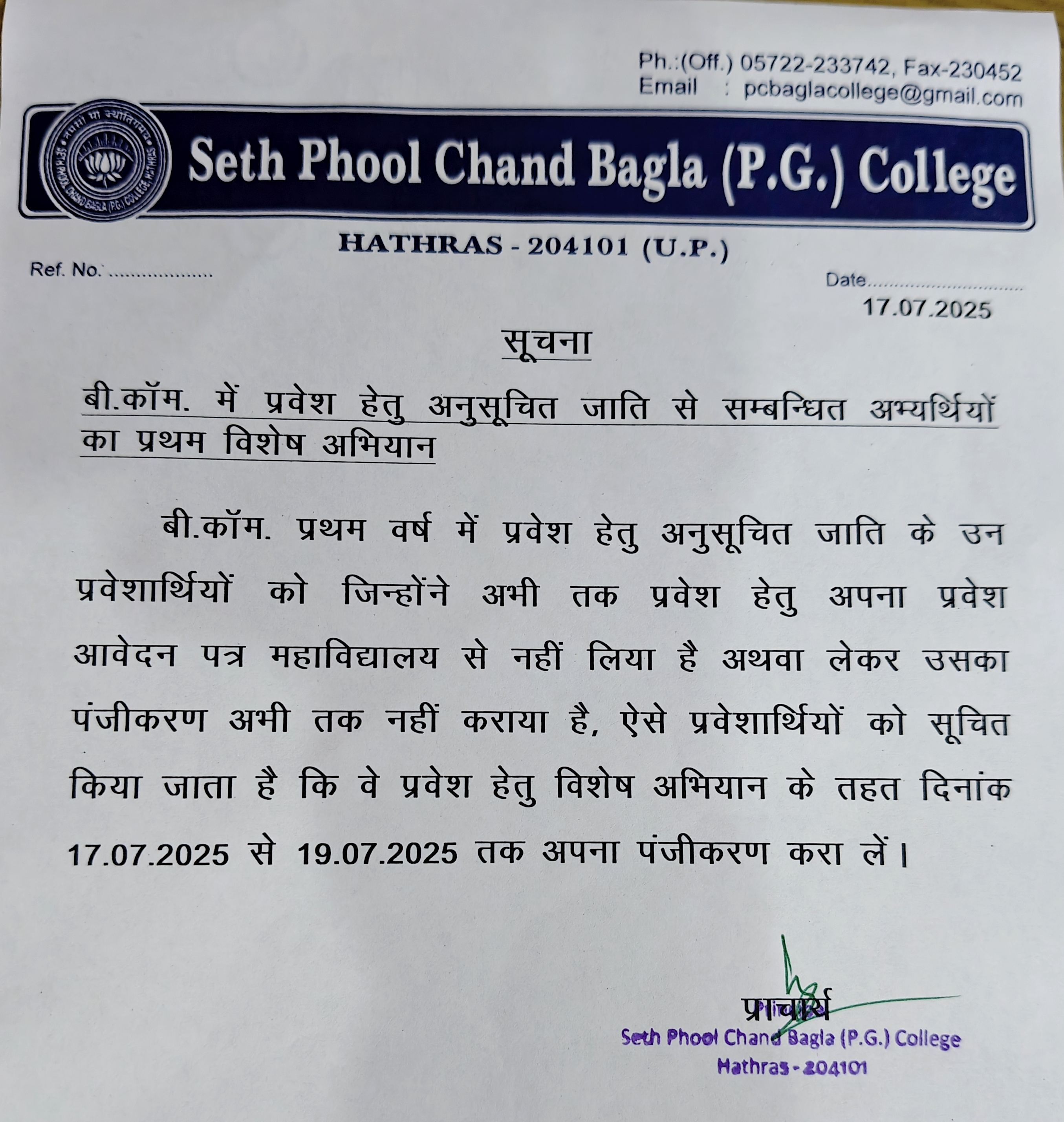 - Second special Drive for S.C. Students of B.com