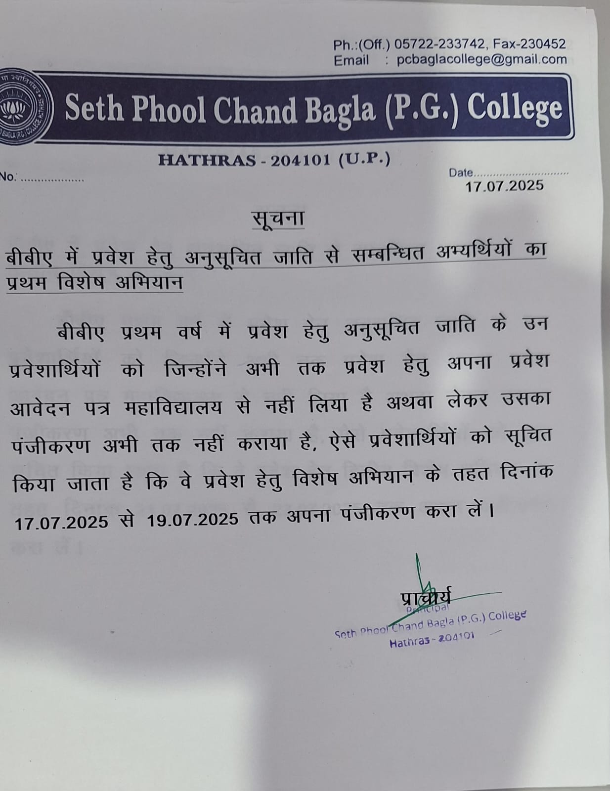 - Second special Drive for S.C. Students of BBA